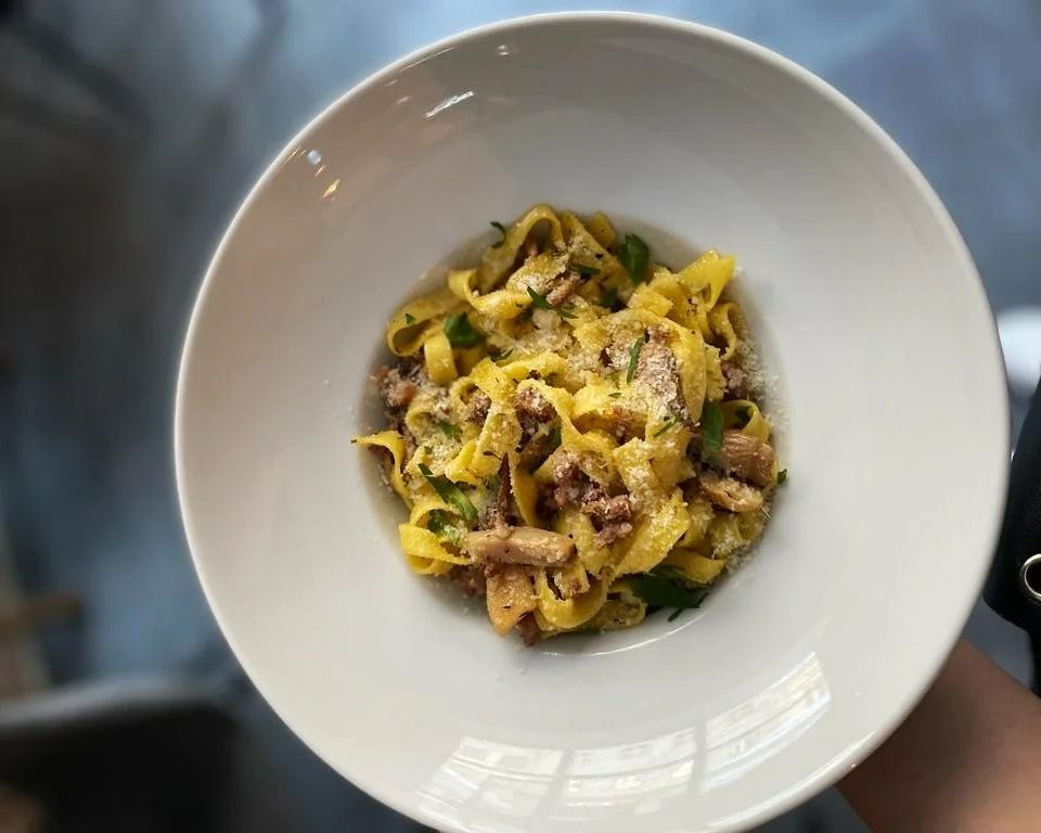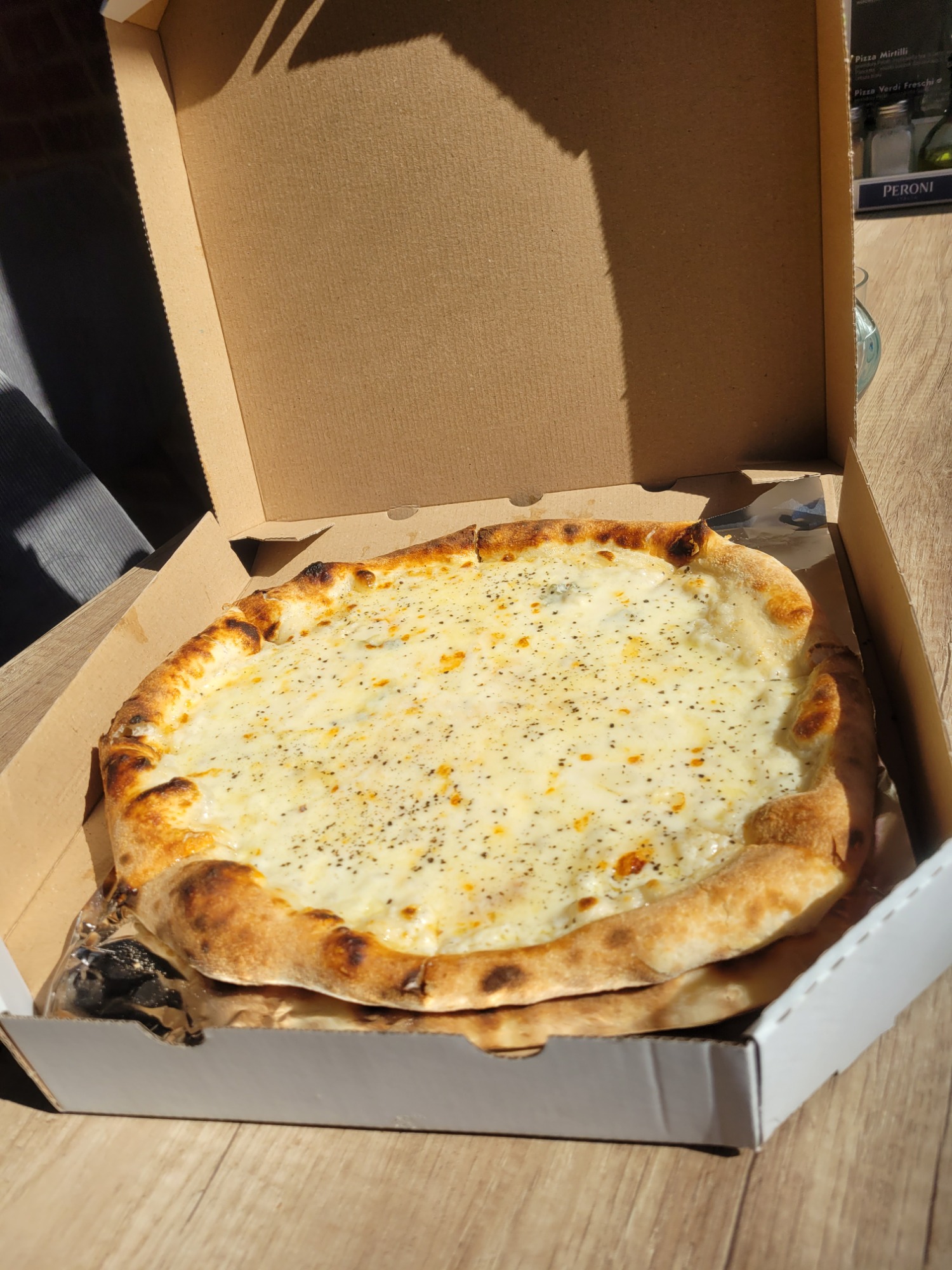 Porcini crème fraîche, mozzarella fior di latte, borowiki smażone z tymiankiem i czosnkiem, Pancetta - włoski boczek dojrzewający, karmelizowana cebula, natka pietruszki